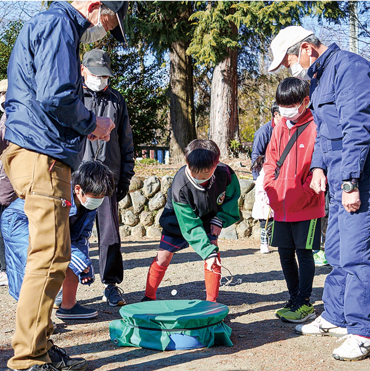 参加した住民は幼児から高齢者まで130人。体操後は、同町会女性部が用意した豚汁や焼き芋が振舞われ、ベーゴマや羽子板、弓矢など、昔遊びをしながら地域交流を楽しんだ。