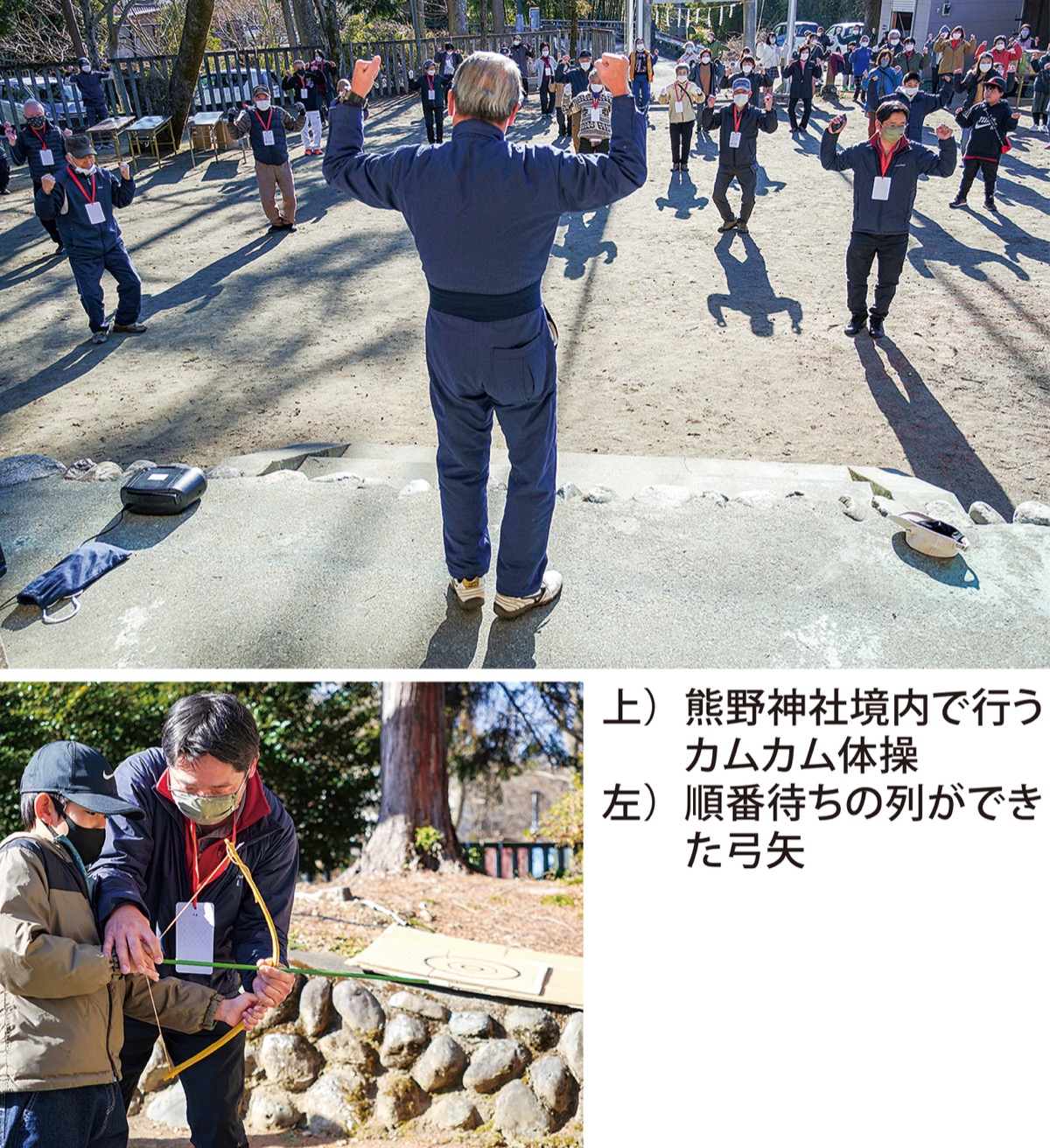 「腕を前から上にあげてのびのびと背伸びの運動から--」。上川町の熊野神社で1月21日、上川町東部町会によるラジオ体操と伝承遊びを組み合わせた「カムカムイベント」が行われた。