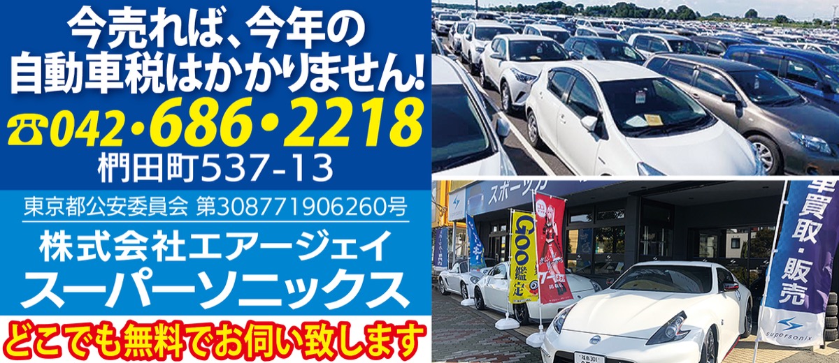 「『廃車はお金がかかる?』いいえかかりません」。転居や免許返納で乗らなくなった車の処分は、高価車買取で話題のスーパーソニックスに相談を。素早く親切な接客が好評。丁寧な対応は店主の車への深い愛情の表れだ。どんなに古い車も普通車なら期間限定で最低価格5万円〜。引き取りや面倒な手続きも全てお任せ。手数料も負担してくれる。「下取りや廃車にする前にご相談を」