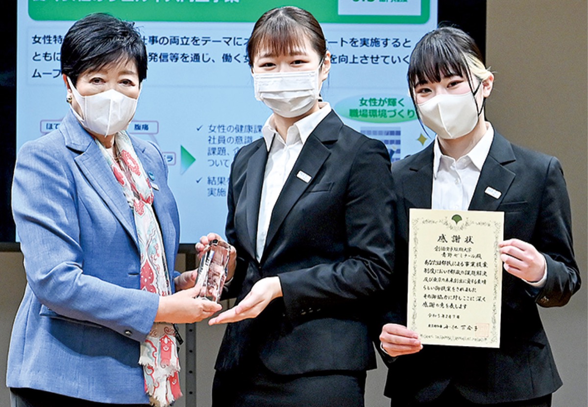 創価女子短期大学(丹木町)青野ゼミナールの学生が立案した女性の働きやすさ向上に関する事業案が、2023年度の都の施策に反映されることが決まった。都民投票により選ばれ、施策には4900万円の都予算が計上される。2月7日の表彰式で、学生らは小池百合子都知事から感謝状を受け取った。