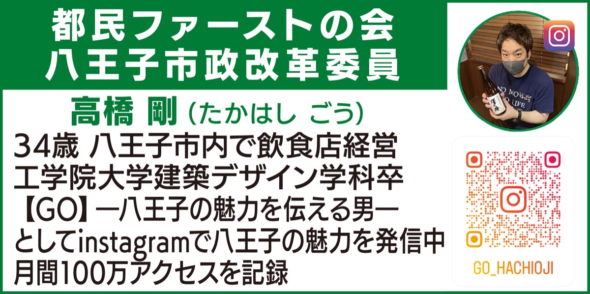 また、今月10日には、都民ファーストの会八王子市政改革委員に高橋剛(たかはしごう)を任命しました。34歳で八王子市内で飲食店を2店経営、インスタグラムで市内飲食店を100店舗以上個人で紹介してきた経験を活かして、今後は政治家として、八王子の魅力づくりや発信力の強化に市民目線で取り組んでいきます。