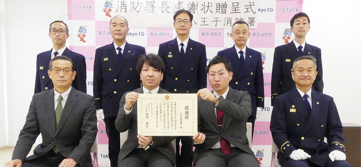 救命活動で功労のあった八王子税務署(明神町)職員の樋口翔平さんと藤本友亮さんが2月24日、八王子消防署(原崎義之署長)から消防署長感謝状を受けた=写真(同署提供)。