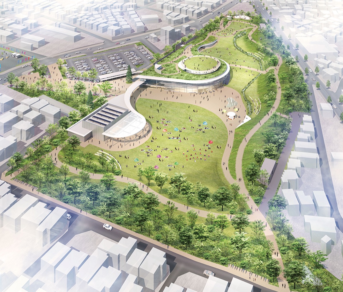 主な施設に公園、ライブラリ(図書館)、歴史・郷土ミュージアムを計画。多様な利用者に配慮したインクルーシブ遊具、円形デザインの建物、半屋外空間の軒下テラスなど各所に趣向を凝らす。市集いの拠点整備課は「運営に力を入れ、利用者が増えるよう魅力を高めたい」と展望。「多世代の市民に、自分たちの施設として思い入れを持って使い方を考えてもらえれば」と市民参加の重要性を強調する。