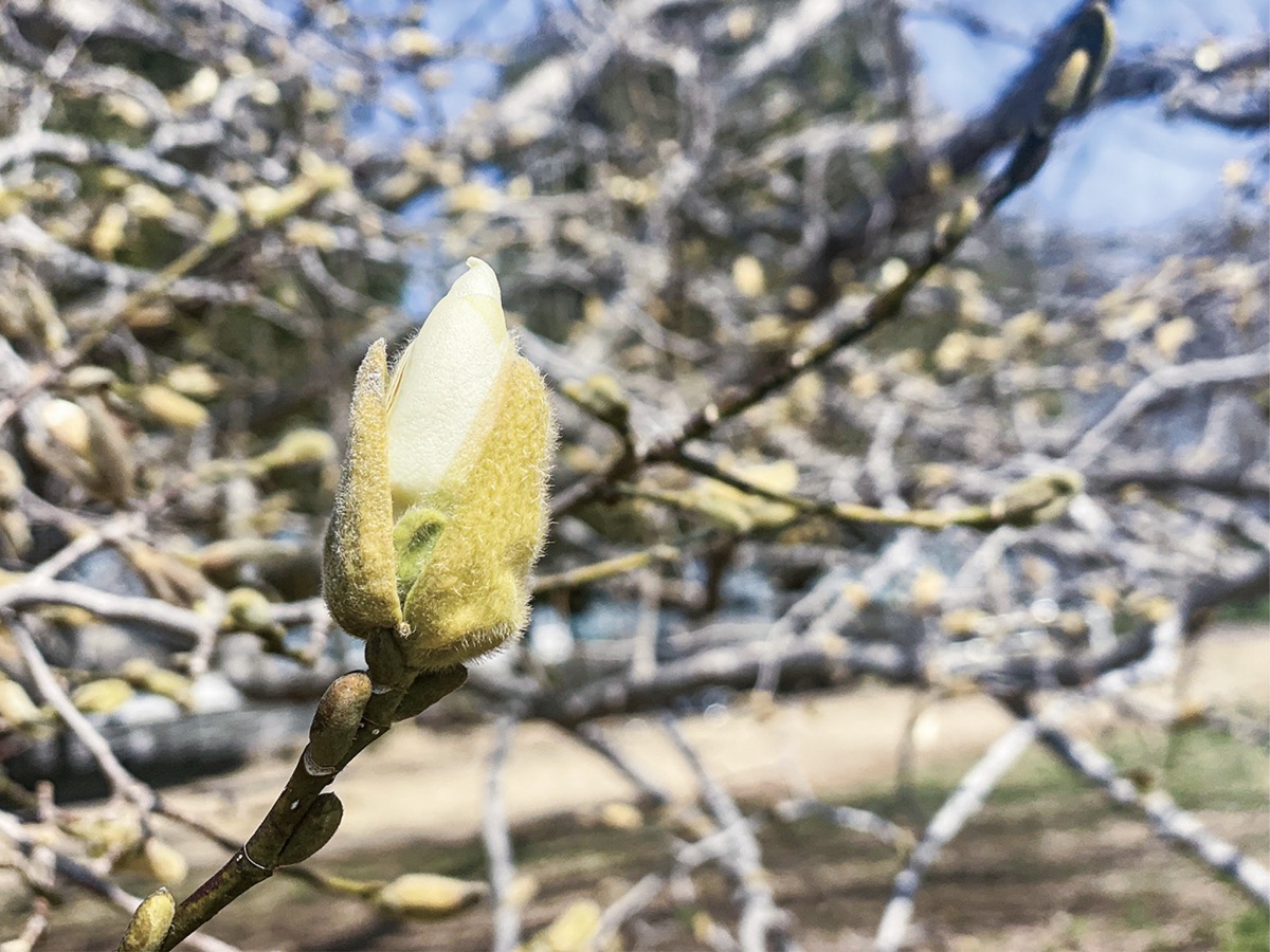 同園北側の「ひよどり山」にある草地広場には、大きな3本のコブシがある。どれも推定樹齢は50年ほどで、日当たりを妨げるものがなく、のびのび大きく育ったとみられる。大和田町からウオーキングに来ていた70代の女性は、「咲いているかなと思ったけど少し早かった。一分咲きに満たないくらいかな。以前満開のときに見に来たことがあるが、木の下にレジャーシートを敷いてくつろいでいる人もいた」と足を止め、つぼみを見上げた。