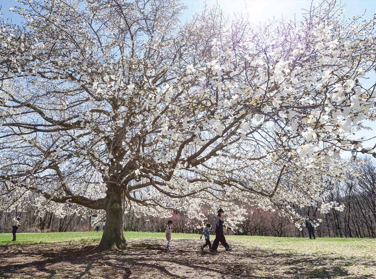 加住丘陵の小高い緑の中、約25万平方メートルの敷地を持つ東京都立小宮公園(暁町2の41の6)で「コブシ」が咲き始め、今月に見頃を迎えそうだ。