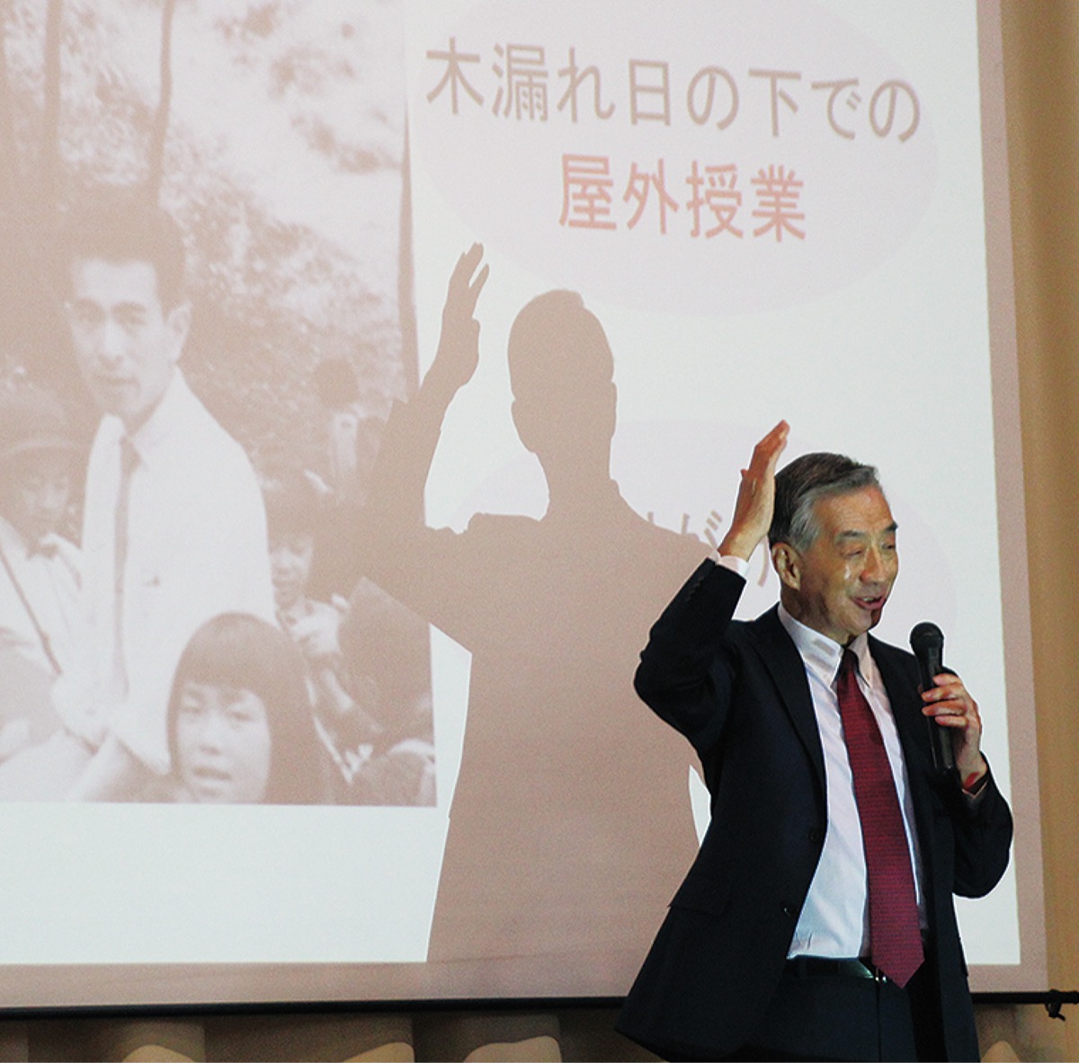 野島社長は1962年度に同校を卒業。4年から6年まで担任だった恩師が、現校長である二宮昭夫氏の初任当時の校長だったという縁もあり、講演の依頼を快諾。同校創立80周年記念講演として実現した。会場となった体育館には高学年が集まり、低学年は教室でオンライン参加した。