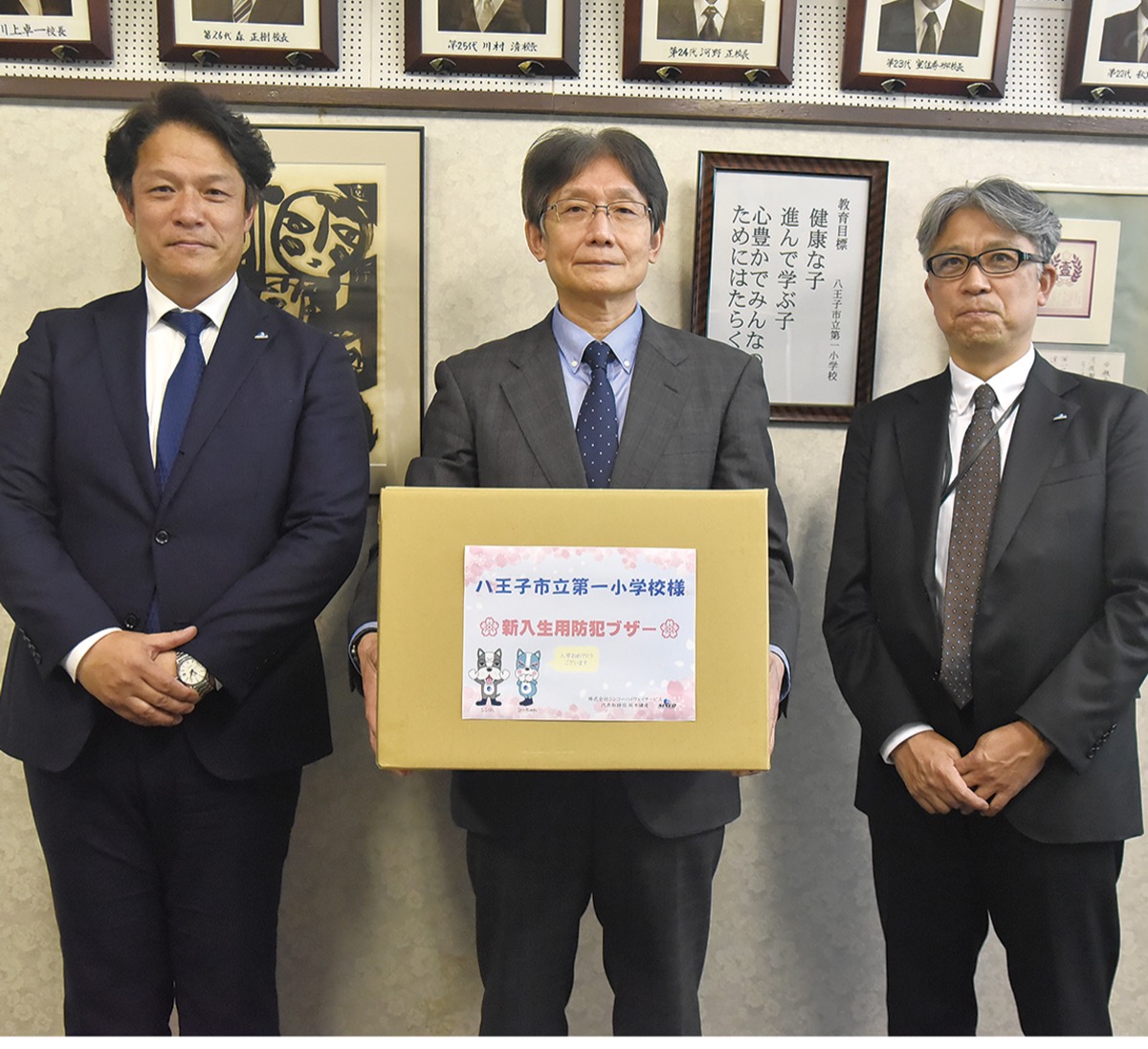 地域ぐるみで子どもたちの見守りを--。新町に本社を構える(株)シンコーハイウェイサービス(坂本健造社長)は、市立第一小学校の新1年生向けに防犯ブザー105個を寄贈。3月10日、同社の森田勝之専務、執行役員の安田哲哉さんら3人が同校を訪れた。