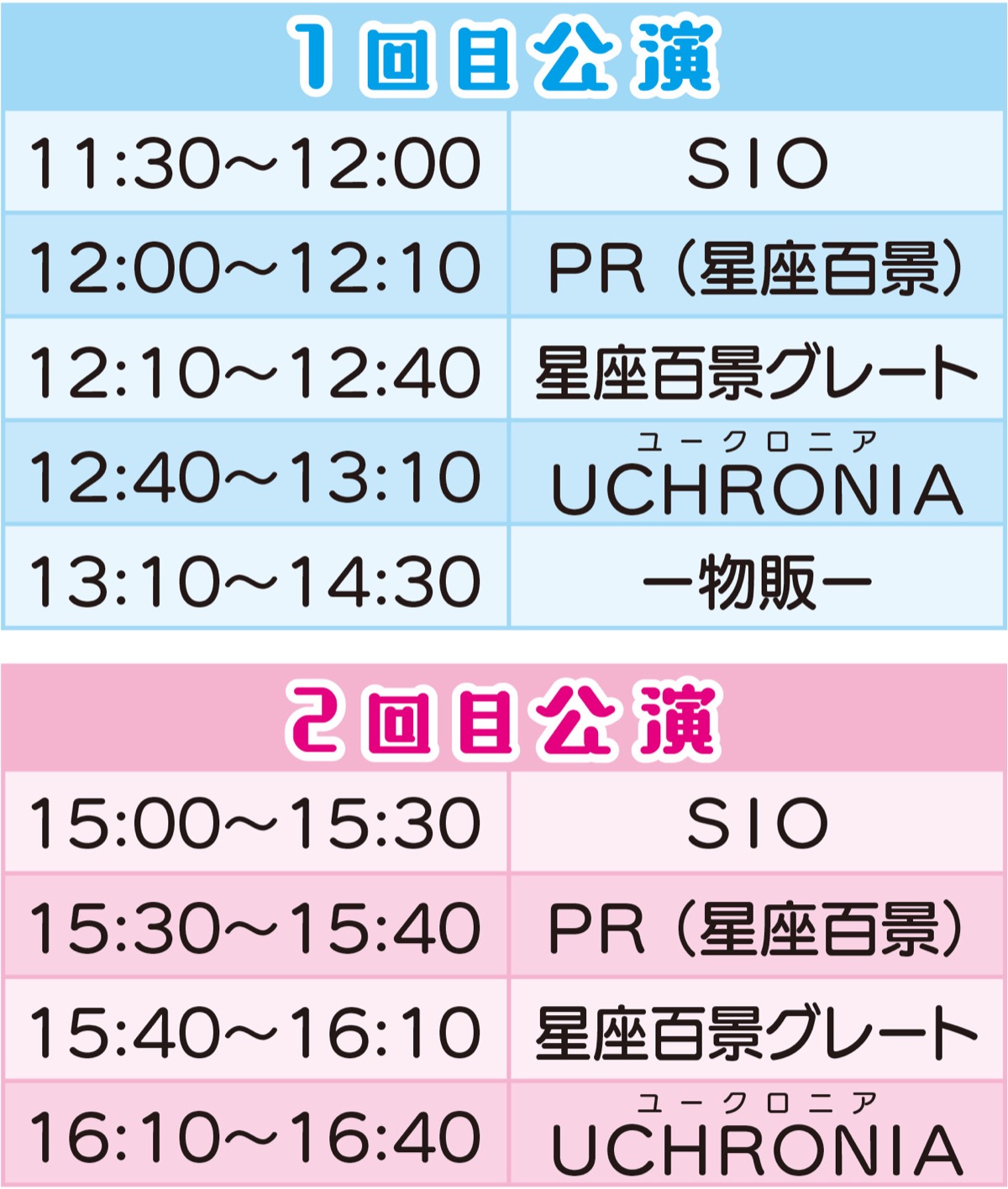 出演者は「帰ってきたヒロイン星座百景グレート」=写真上=、シンガーソングライター「SIO」=写真中=、男性ボーカルユニット「ユークロニア」=写真下=の3組。2回公演を行う。