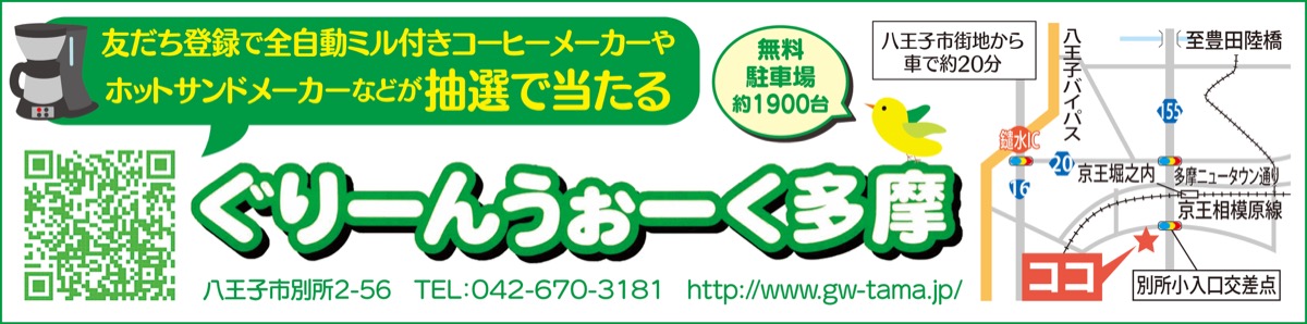 16周年キャンペーンとして、ぐりーんうぉーく多摩のLINE公式アカウントの「友だち登録」者に、抽選で豪華景品が当たる。抽選期間は4月8日(土)から23日(日)。下記二次元コードから友だち登録すると、抽選に参加できるクーポンが届く。既に友だち登録している人も対象。