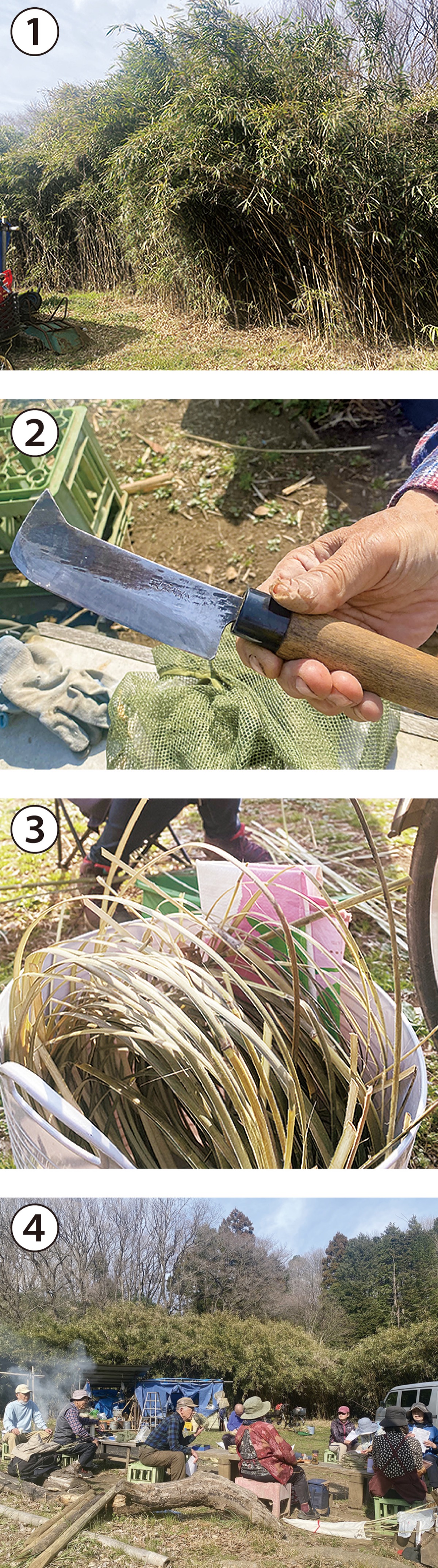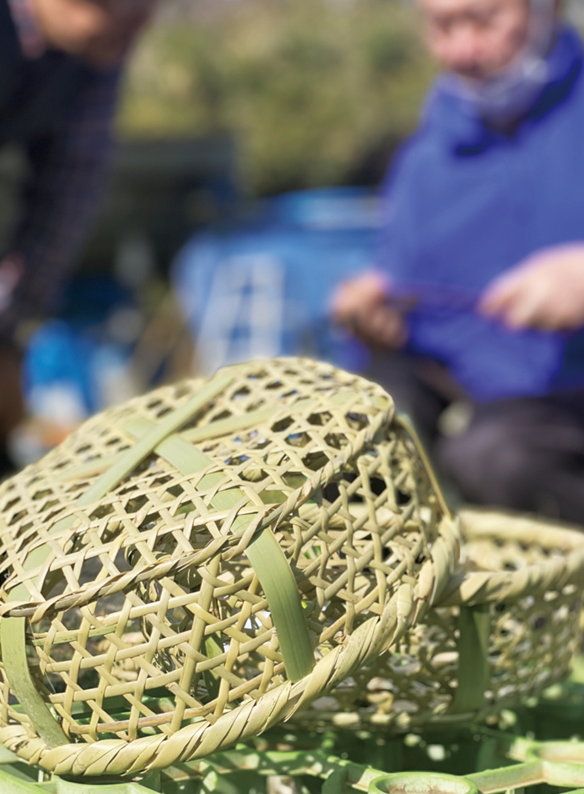まず篠竹を伐採し、刃の背の先端にツノがある「メカイ包丁」で皮部分を剥ぎ取り、材料となる「ヘネ」を採る。作るかごの大きさにもよるが、小かごなら1本の長さは30〜40センチほど。かごが大きくなればなるほど長さが必要になり、「弓のようにしなやかに垂れる」のが理想的な硬さという。このヘネを編み、底部分から胴部分を形成していく。縁にあたる箇所にあてがった芯に沿ってヘネを巻き、「力骨」と呼ばれるしっかりしたヘネを、底の中心を通るように目をくぐらせる。このときメカイ包丁のツノ部分で押し込むのがコツだ。