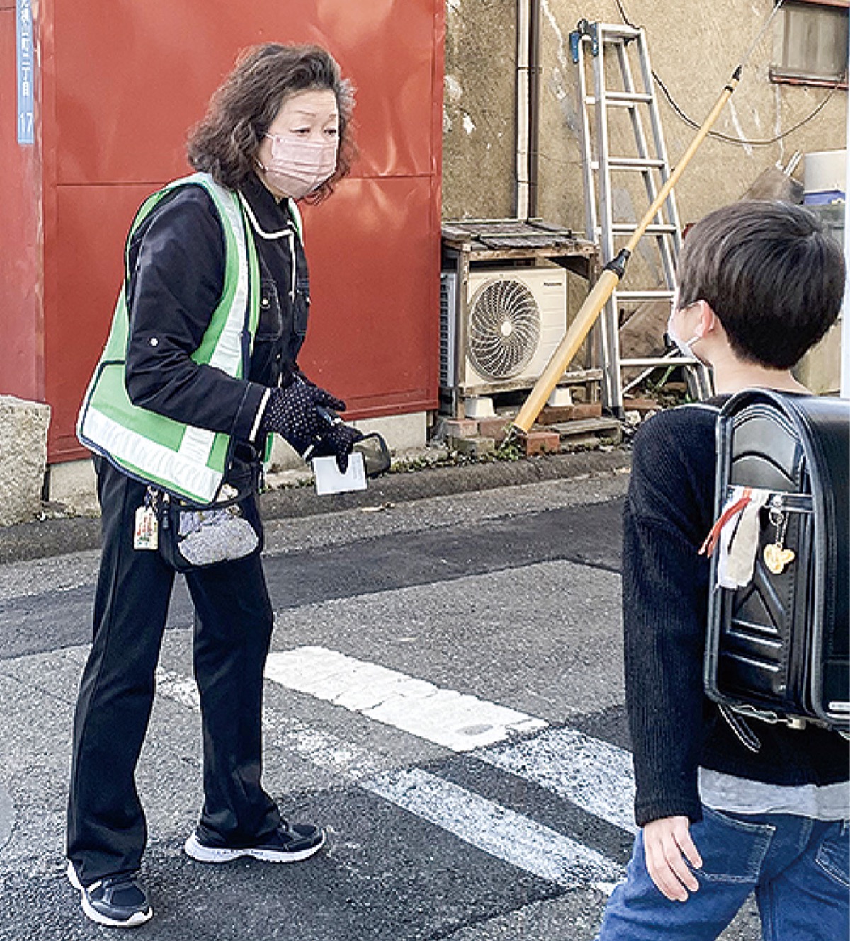 第一小学校(元横山町)の通学路の見守りをして16年という中村れい子さん(74)=本町在住。黄緑色のゼッケンを着て、メモを片手に通学路を歩き回る「遊軍」だ。目についた児童に「おはよう」「6年生だよね、卒業おめでとう」と声をかける(取材時3月下旬)。「どの子が何時にどこを通るかはメモしてる。顔も頭に入っている」と驚異の記憶力だ。平日のほぼ毎日、1日で4、5千歩はいくという。児童を狙った犯罪も気にしており、「自分があいさつをしながら立つことで、犯罪を許さない街の雰囲気づくりにつながるのでは」と話す。