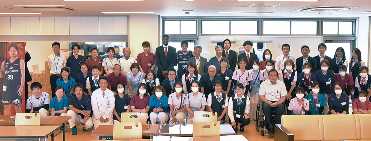 バスケットボール男子B3・東京八王子ビートレインズのスポンサーで、運営会社の「アスリートセカンドキャリア支援事業」に協力する医療法人財団興和会(右田敦之理事長)右田病院。同クラブの選手とスタッフは5月2日、暁町の同院を訪れ、右田理事長や職員と交流した=写真。