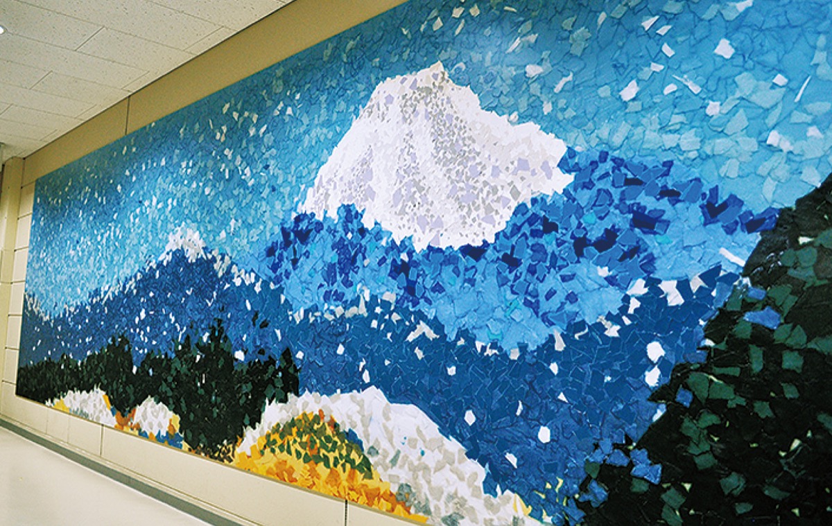 プロジェクトは「アートの力で地階を少しでも居心地良く、穏やかな気持ちで過ごせる空間にしたい」という同院の想いに同大の福田秀之教授ゼミナールが賛同し、2022年4月からスタート。同ゼミでグラフィックデザインを学ぶ19人の学生が現地視察や職員へのヒアリングを通してデザインを考案し、昨年末に行われたプレゼンテーションを経て、ちぎり絵の手法で『折々の八王子』を表現するデザインに決定した。
