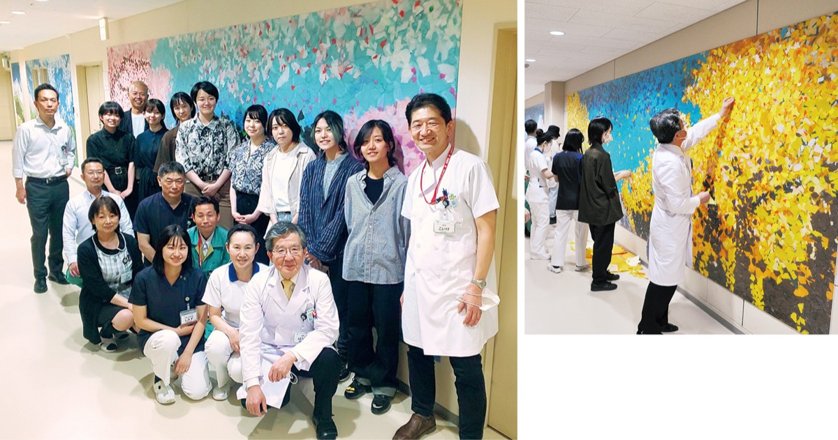 完成披露会の日に仕上げの作業が行われ、同院の原田信比古理事長や小池伸定病院長などの病院職員、福田教授とゼミ生が協力して、壁画にちぎった色紙を重ねて完成させた。プロジェクトの発案者でもある小池病院長は「コロナ禍の難しい状況の中で多くの方々のご協力やご支援をいただき、この日を迎えることができた。皆さんの力作を大切に飾らせていただきます」と感謝。福田教授は「デザイナーの卵である学生たちに貴重な経験をさせていただいた。この作品に取り組んだことが数十年後に大きな財産になっていると思う」と学生たちの将来に期待を寄せた。