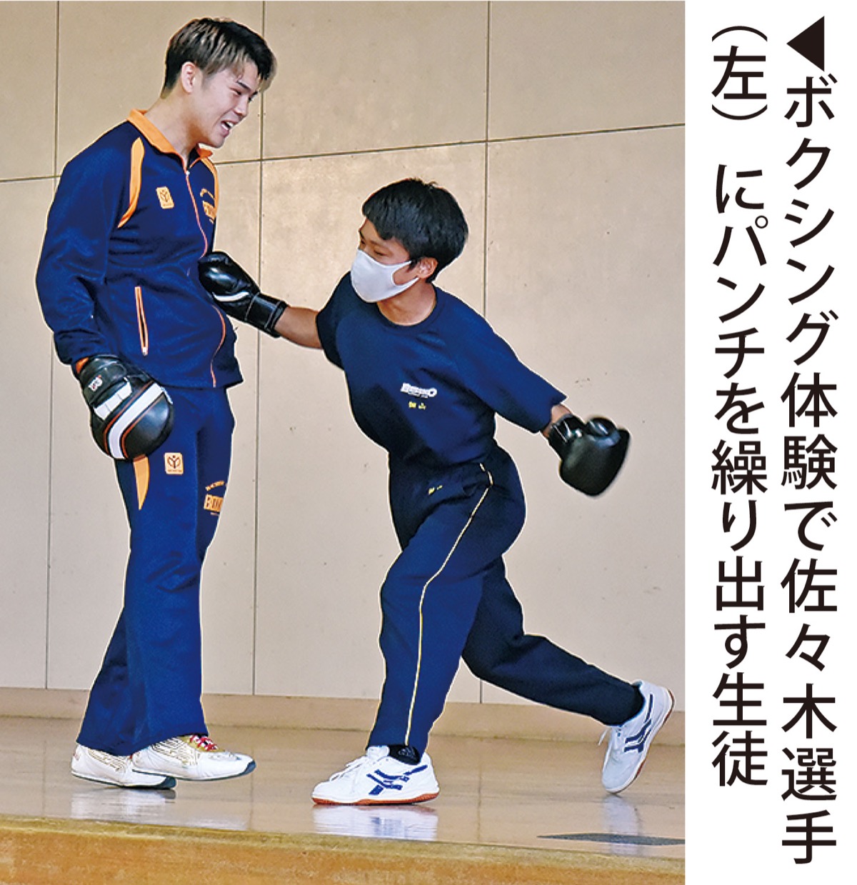 卒業以来の母校訪問となった、WBOアジアパシフィック・ウェルター級王者の佐々木選手。体育館のステージでは、代表生徒がグローブを着用して佐々木選手にパンチを打つボクシング体験の場が設けられたほか、佐々木選手への質問タイムも。「食事のケアは」との問いには「好き嫌いなくまんべんなく食べている」と回答。魚や肉などたんぱく質を意識的にとることも話した。いつからプロを目指していたかを聞かれると、中3のとき、クラスで将来の夢として「ボクシングの世界王者」と発表した話を披露。「恥ずかしいことではない。人前で夢をどんどん言ってほしい」と呼びかけた。