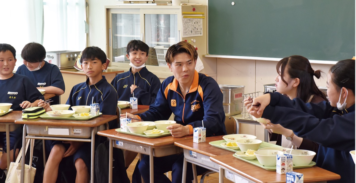給食の時間には、佐々木選手が教室で生徒と食事。今回の献立は、ごはんと赤魚の利休焼き、田舎汁、野菜のじゃこ和え、果物、牛乳。同じ献立が5月中に1回ずつ、市内各校で提供された。一緒に食事した十河(そごう)莉未さん(12)は「何でも食べる佐々木さんはすごい。苦手な食べものがあるけれども、少しずつ頑張りたい」と話した。