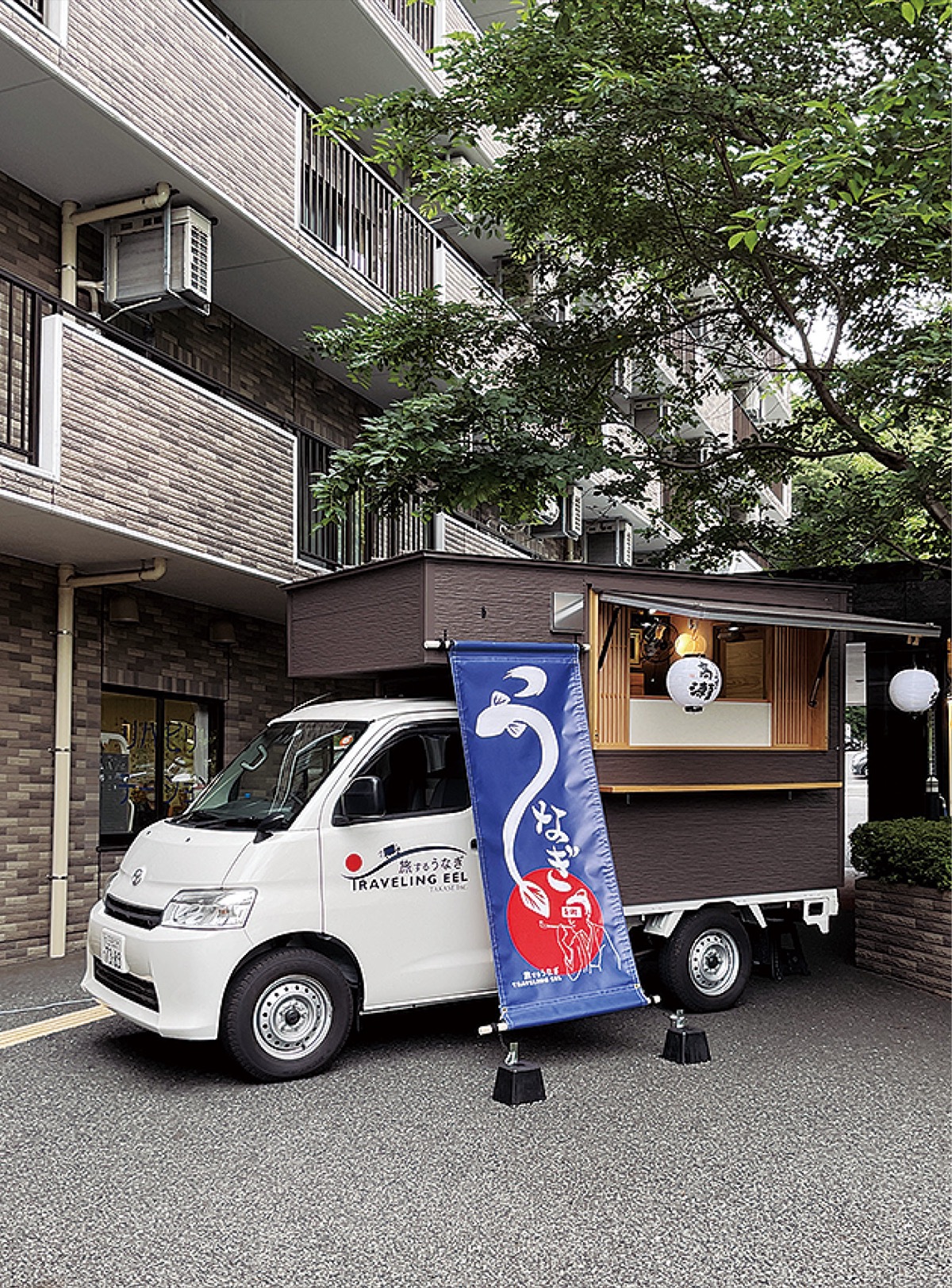 車内には炭火を扱うための設備が組み込まれ、食器類を収納するスペースもあるため、うなぎを店舗と同じ「お重」で提供することができるという。車体には業態が一目でわかる「旅するうなぎ TRAVELING EEL」のロゴがきらめく。