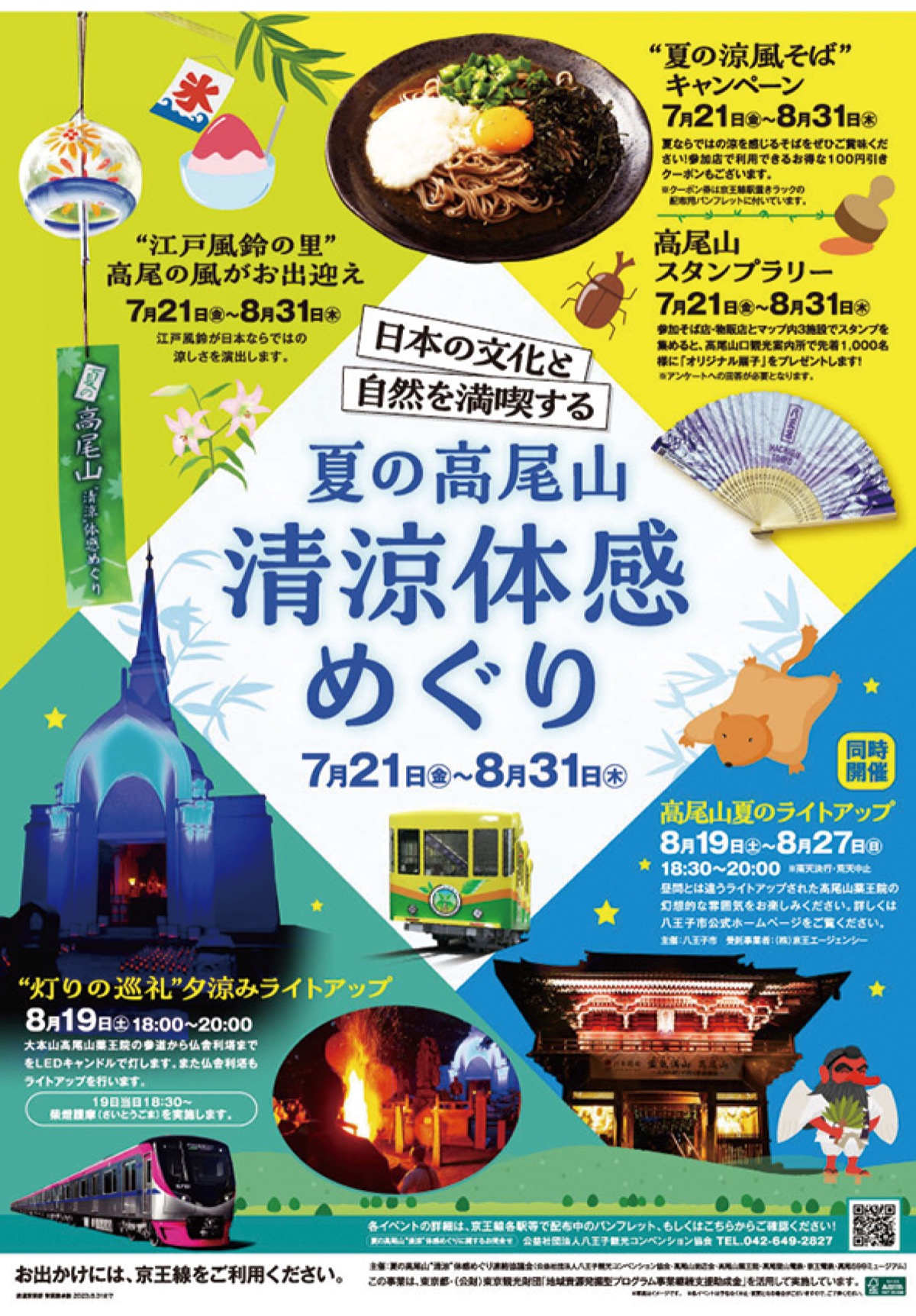 ▽「夏の涼風そば」キャンペーン...8月31日まで/参加16店のそば処で使用できる100円引きのクーポン券を提供(パンフレットに付属)▽スタンプラリー...同/パンフレットに記載の参加そば店と物販店、マップに記載の3施設の計5つのスタンプを集めると、高尾山口観光案内所で先着1000人にオリジナル扇子をプレゼント▽「江戸風鈴の里」高尾の風がお出迎え...同/沿道の商店会などに並んだ江戸風鈴が涼しさを演出▽「灯りの巡礼」夕涼みライトアップ...8月19日(土)午後6時〜8時/参道や仏舎利塔をライトアップ。午後6時30分から柴燈護摩も実施