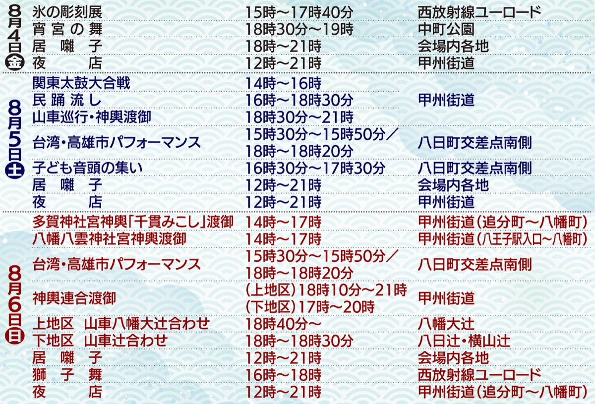 他にも4日は「氷の彫刻展」、八王子芸妓による「宵宮の舞」など。5日は約4000人の踊り手による「民踊流し」、子どもたち約400人が仲良く踊る「子ども音頭の集い」、甲州街道に和太鼓がずらりと並ぶ「関東太鼓大合戦」など。6日は郷土伝統芸能「八王子の獅子舞」など。5日と6日には海外友好交流都市・高雄市(台湾)によるパフォーマンスなども。夜店も並ぶ。