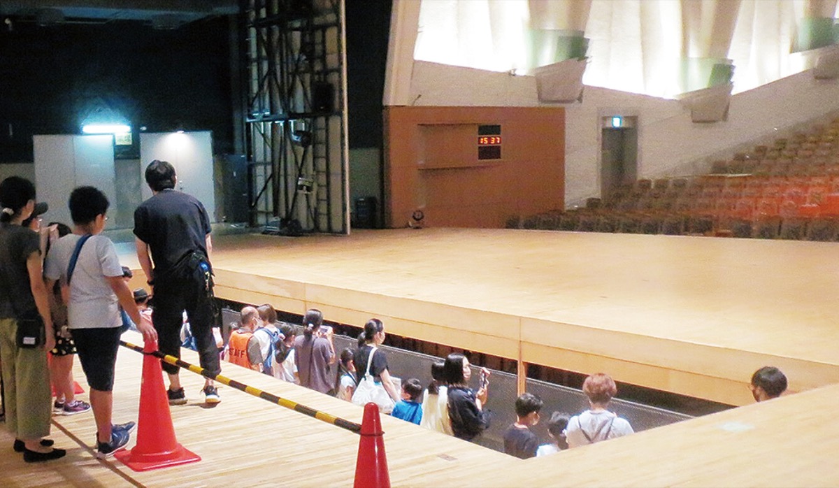 通常は見ることができないホールの舞台ウラや演出装置を見学するツアーを、いちょうホール(本町)が8月13日に企画。市内小学校の3年生から6年生と保護者ら約160人が参加した。