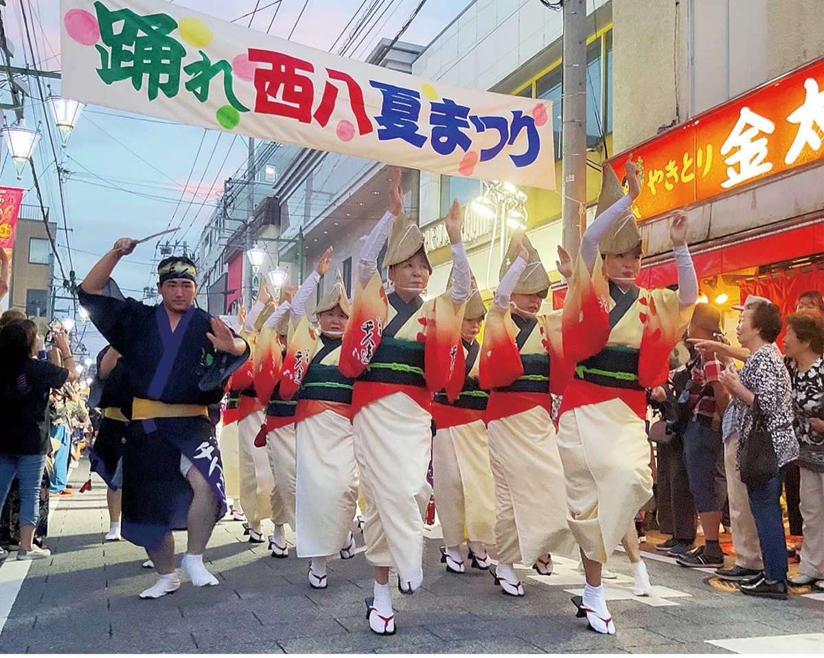 晩夏の西八王子を盛り上げる「第22回踊れ西八夏まつり」が、9月2日と3日にJR西八王子駅北口周辺で催された。地域の活性化と親睦を深めようと、2002年から地元の西八商栄会(磯間光夫会長)が中心となって運営している。コロナ禍で4年ぶりとなった今回は阿波踊り15連、よさこいソーラン15チームの総勢850人以上が出演し、熱気あふれる演舞を披露した。
