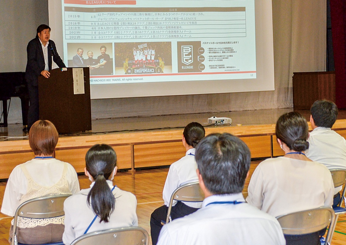 校外から講師を招いて毎年行われている研修。今回はプロバスケットボールB3・東京八王子ビートレインズの運営会社、(株)THTマネジメント(子安町)で営業責任者を務める沢登敏也さん(44)が講師に。研修には教員約120人が参加し、組織運営やビジネスマナーについて聞いた。
