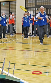 20回目の今大会には90歳以上も14人出場。5メートル先のポールめがけて9本の輪を投げ入れ、合計得点を競い合った。成績は後日発表される。鈴木会長は「高齢でも元気な人の姿を見ると、他の人も元気をもらえる。みんなで楽しみながら仲間の輪を広げてもらえば」と話している。