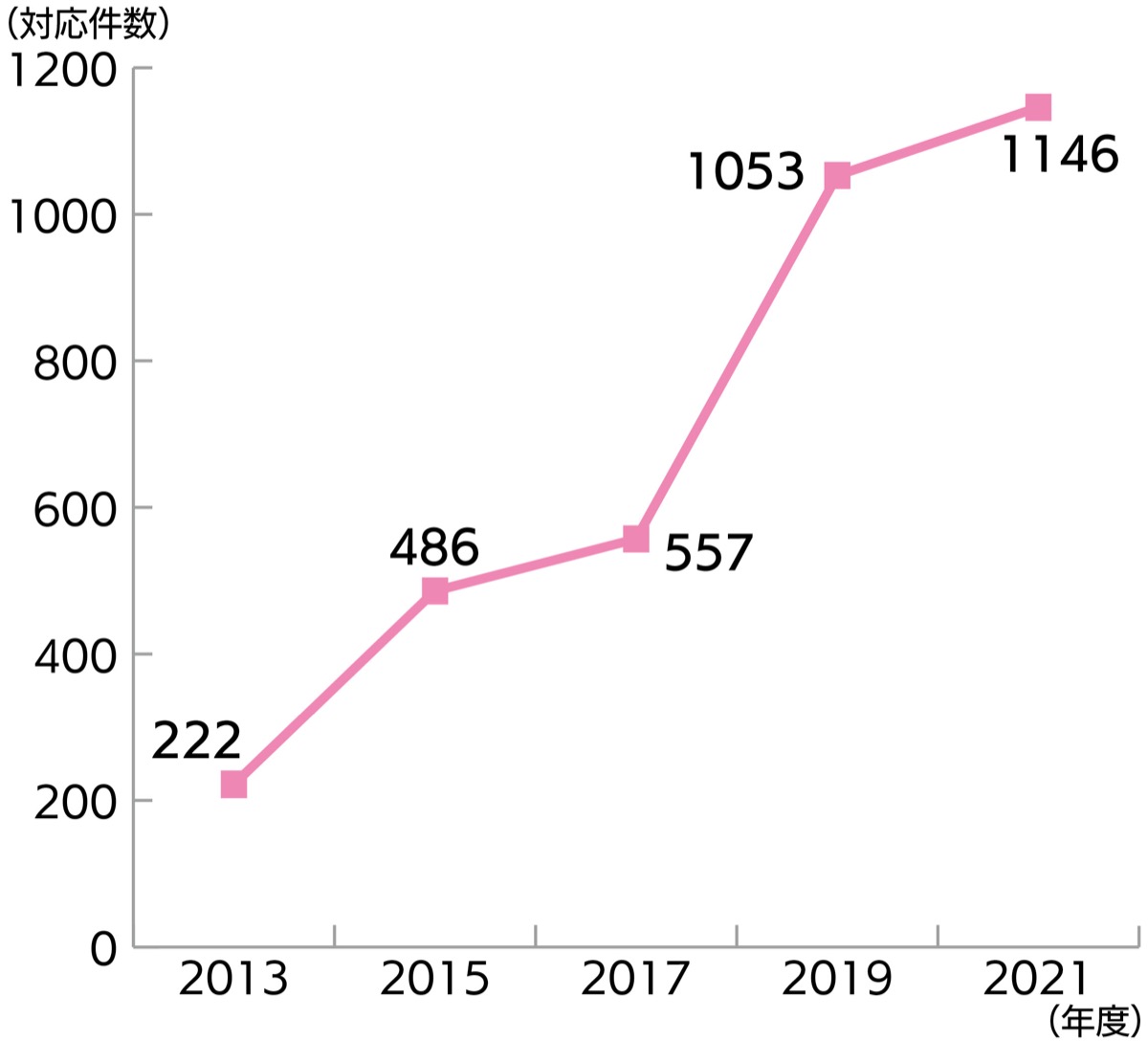 同相談所では、03年度に222件だった市内相談対応件数が21年度には1146件と約5倍に。22年度の速報値は明らかでないが、上昇傾向であることが予想される。