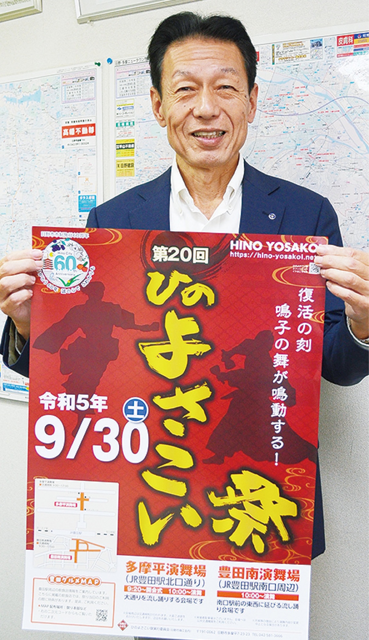 よさこいの本場・高知県さながらの「流し踊り」を中心に、会場や日程は年によって異なるが主に豊田駅周辺をメイン会場に開催。バスで踊り手を移動させながら日野・豊田・高幡不動の3会場で同時開催した年や、日野の代表連を作って高知のよさこい祭りに遠征したこともあったという。昨年はコロナの急拡大で開催目前に中止を決断することになり、くやしい思いを味わった。