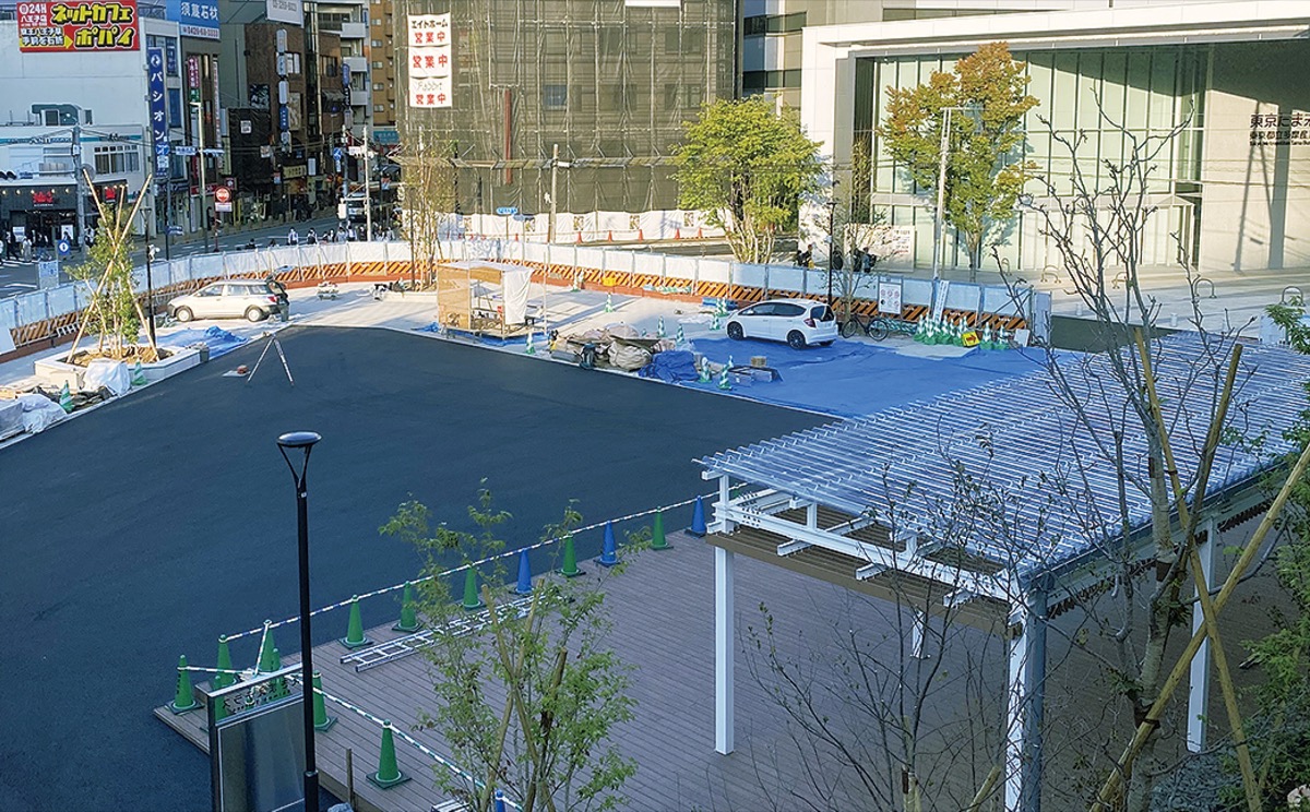 「えきまえテラス」があるのは、JR八王子駅から京王八王子駅をつなぐ東放射線アイロードの途中。東側には昨年開所した産業交流センター「東京たま未来メッセ」が隣接する。面積は約2000平方メートル。貸し出しエリアは舗装部分が320、人工芝部分が450、デッキ部分が180(いずれも平方メートル)。現在、開園に向け工事中だ。