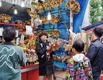 熊手が売れると景気付けの手締めが行われ、境内に威勢の良い掛け声が響きわたった。「大きい熊手から売れていく」と話す八王子露商組合の安西一組合長は「ご利益のある酉の市。一の酉に来れなかった人は、ぜひ二の酉へ」と呼びかける。