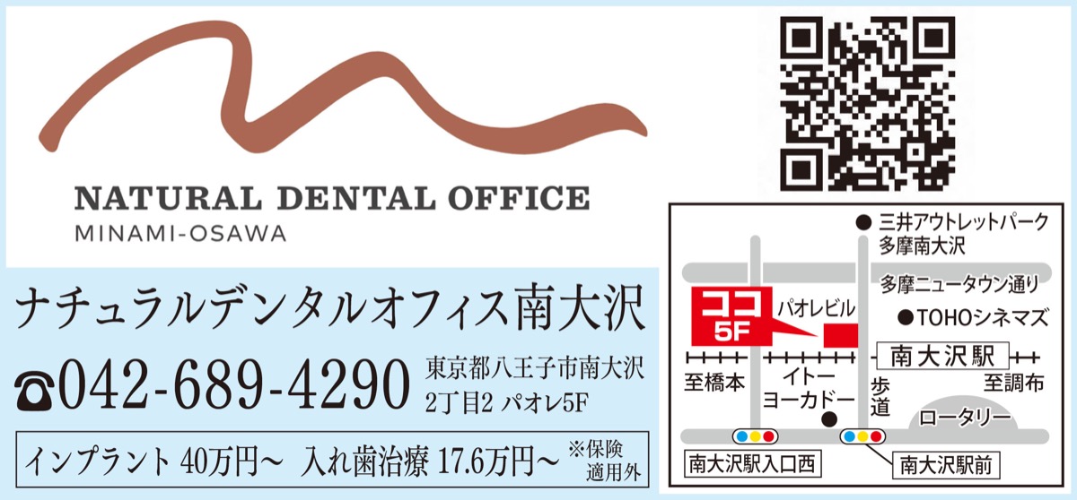 パオレ内モスバーガーの真上にあるナチュラルデンタルオフィス南大沢は、歯を失った時に選択肢となる『入れ歯治療』『インプラント治療』、どちらの治療も受けられる。「どちらかが得意な医院は多い中、当院はどちらの治療も得意としており、患者さんの希望をしっかり聞き一人一人に合わせた治療を提供している」と話すのは遠藤広規理事長。インプラント治療の講師も務める遠藤理事長を中心に、近山琢郎院長も治療に当たる。外科処置は個室のOPE室で行い、海外製ではなく日本製のインプラントを使用して治療する。