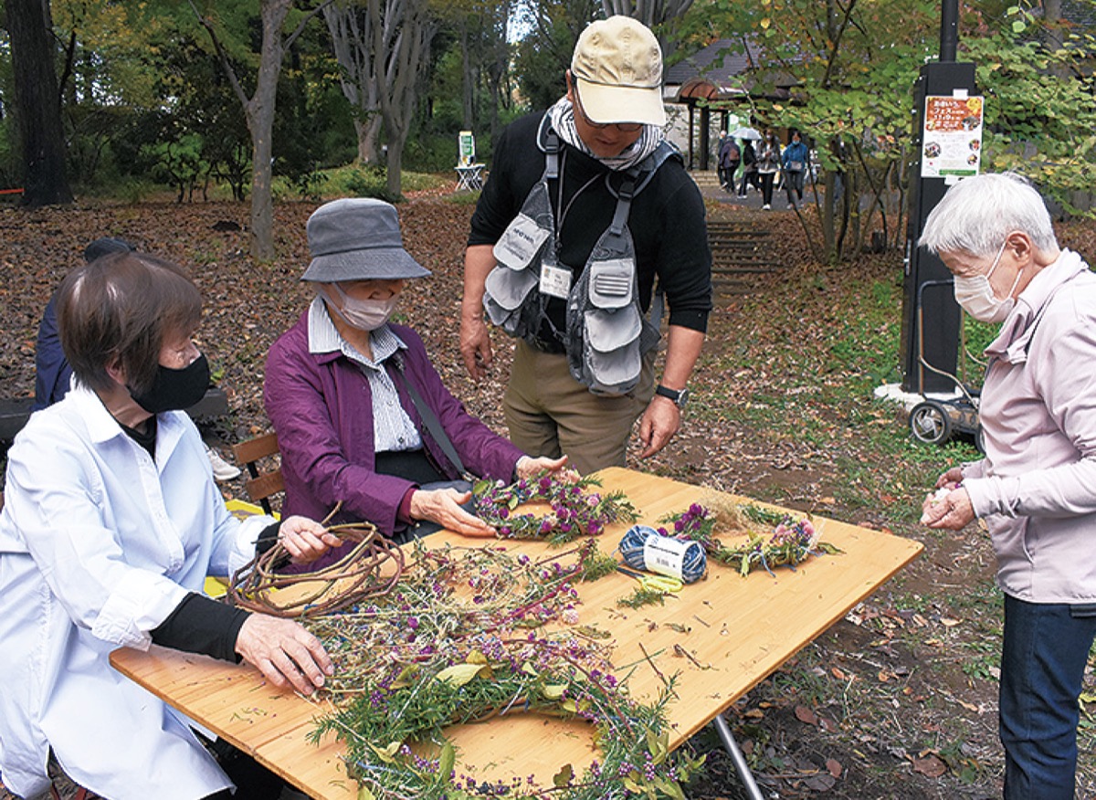 「シニア向け」と銘打たれたこの催しは、月1回行われている「青空体操@小宮公園」の拡大版。通常企画である理学療法士によるフレイル予防体操や公園内を植物解説付きで歩く自然案内ガイドウォークのほか、この日はたき火や焼き芋、竹箸けずりやリース作りに挑戦。参加者らは自然の中で体を動かしリフレッシュした。