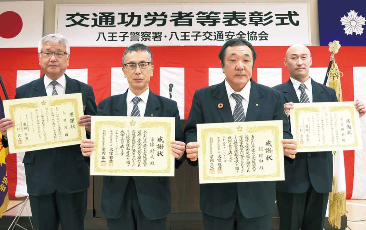 今回は交通事故防止寄与団体として都立八王子桑志高等学校に感謝状が贈られるなど、6団体と33人が表彰された。同社からは、日頃の安全運転が事故抑止につながり、交通安全に寄与しているとの評価を受けた4人が受賞。交通部長・東京都交通安全協会長連名感謝状の一般優良運転者に宗像晴美さんと舘雅和さん、八王子警察署長・八王子交通安全協会長連盟感謝状の優良運転者に土屋茂さんと小宮輝好さんが名を連ねた。日頃から「もう1台前」の車両の動きまで注意して運転しているという舘さんは「とても光栄に思う。これからも安全運転で無事故を続けていきたい」と話した。