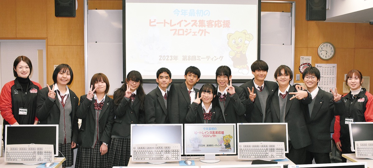 八王子のプロバスケチーム「東京八王子ビートレインズ」が都立八王子桑志高校と集客企画を考案中だ。1月9日に、8回目の打ち合わせを開催。トレインズスタッフが同校を訪れ、3月22日と23日にエスフォルタアリーナ八王子で行われるホーム戦の来場者増加を目標にさまざまな企画について話し合った=写真下。
