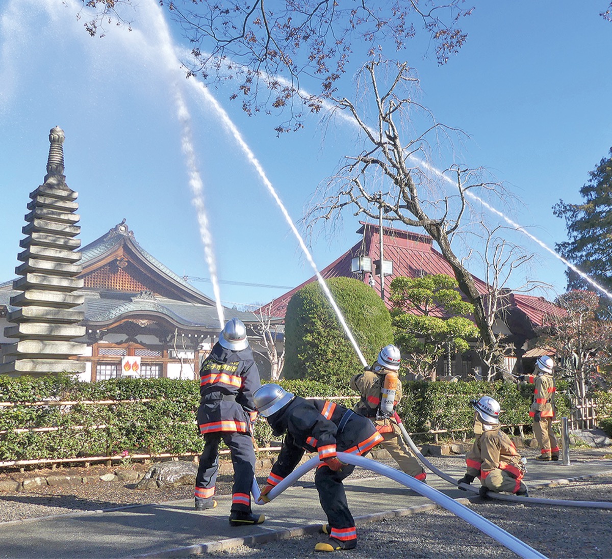 永林寺の消防演習には由木2小隊、由木指揮隊、八王子市消防団第12分団、八王子災害時支援ボランティアが参加。同寺関係者らと連携して、本堂からの出火を想定した119番通報、初期消火、文化財の持ち出し訓練、消防隊と消防団隊による一斉放水などが行われた。