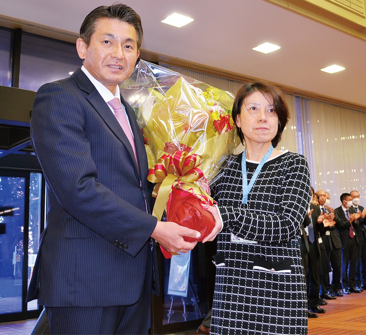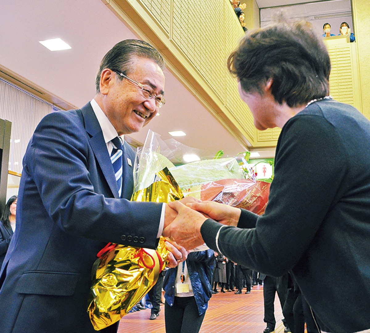 退庁セレモニーでは見送りに集った市職員や支持者、家族から花束を受け取り、盛大な拍手に包まれて庁舎を後にした。