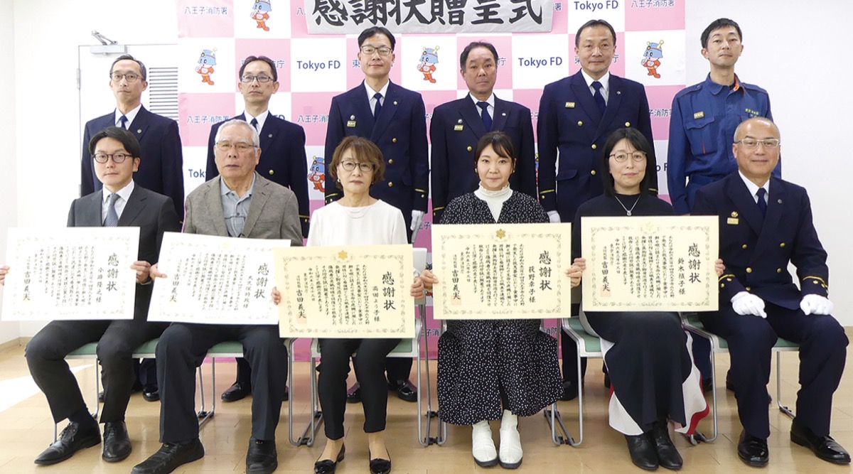 餅をのどに詰まらせた高齢者を見事な連携で救命した市内の5人に消防総監賞感謝状が贈られ、八王子消防署(戸谷彰宏署長)で2月13日に贈呈式が開かれた。