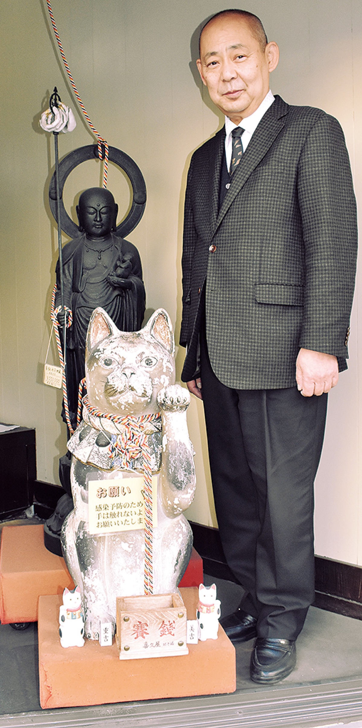 一般的に、あげる手が左だと雌、右だと雄だと言われている。この猫は雌。大正時代に流行した3頭身型で大正猫とも呼ばれる。橋本さんはこの猫を、祖母と父から1字とって三吉(みよし)と名付けた。「不思議なご縁を運んでくれると感じる。有難い」と橋本社長は話す。