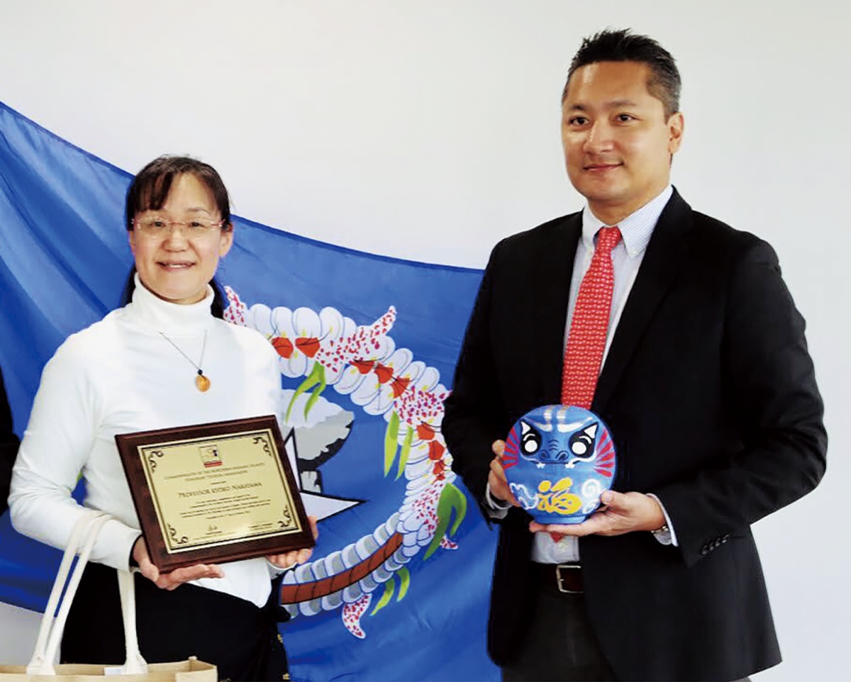 表彰式では、同政府観光局長から感謝の意を表す盾が贈られた。今回は名誉観光大使として表彰されたが、中山教授は「大使として通達された明確な使命はなく、今までの活動への評価だと認識している。これからもマリアナ諸島の歴史や文化、魅力を広めていきたい」と話した。
