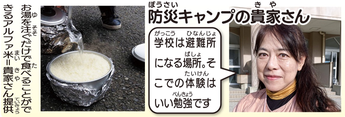 例(たと)えば、毎年(まいとし)、市(し)の協力(きょうりょく)で防災倉庫(ぼうさいそうこ)にある避難物資(ひなんぶっし)を借(か)りています。ただ、そこにある毛布(もうふ)は「ペラペラ」。「みんなそこで初(はじ)めて気(き)が付(つ)くわけです。こんなにペラペラだったら寒(さむ)いよ!って」。また、学校(がっこう)で管理(かんり)している七輪(しちりん)でお湯(ゆ)を沸(わ)かしアルファ米(まい)を食(た)べます。「50人分(にんぶん)のアルファ米(まい)を作(つく)るには8L(リットル)の水(みず)が必要(ひつよう)。水道(すいどう)が通(とお)っていればまだ良(よ)いですが、断水(だんすい)の場合(ばあい)は…」