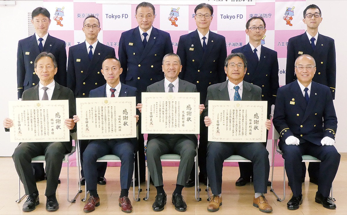サッカー競技中に意識を失った高齢者を見事な連携で救命した4人に消防総監賞感謝状が贈られ、八王子消防署(戸谷彰宏署長)で3月1日に贈呈式が開かれた。