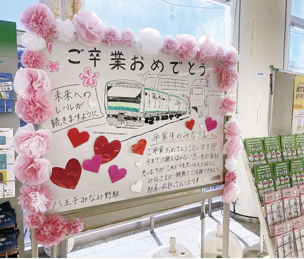 東京工科大学や日本工学院八王子専門学校(共に片倉町)、山野美容芸術短期大学(鑓水)などの学生が利用する同駅。ボードには、グリーンカラーの横浜線車両イラストに、「未来へのレールが続きますように」という駅員からのメッセージが書かれ、卒業生たちにエールを贈った。