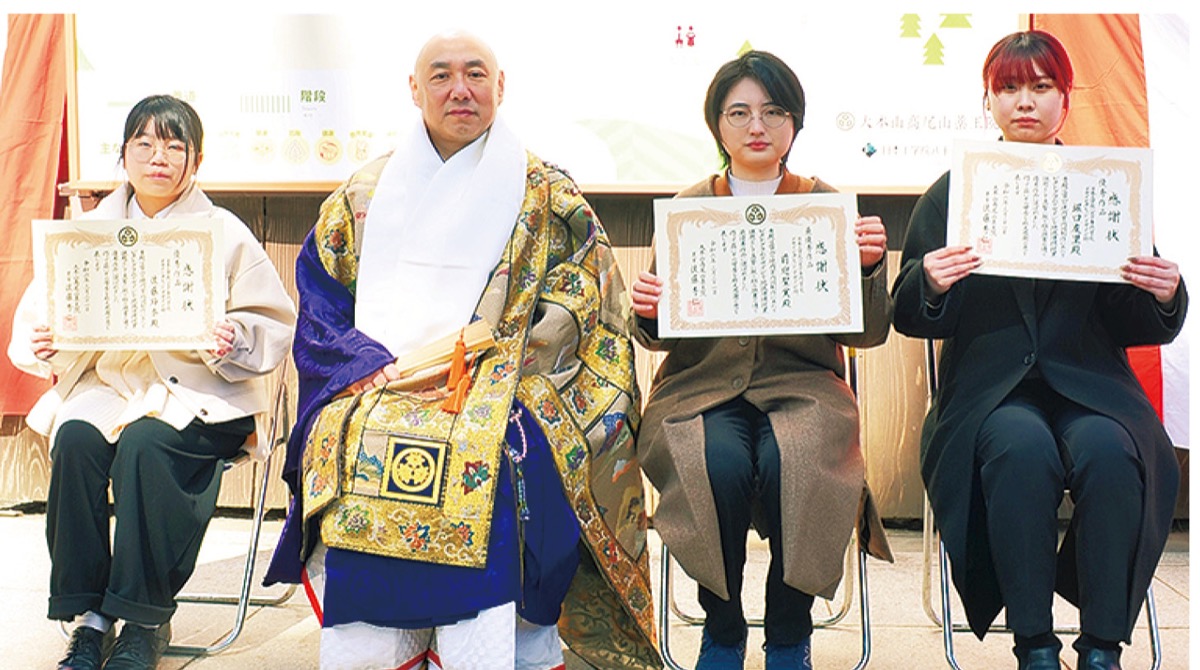 看板は脚部を除いた高さ2・4メートル、幅2・8メートル。高尾山中腹にある薬王院の境内、護摩受付所前に設置された。21日に除幕式が催され、佐藤貫首から最優秀作品の前迎さん、優秀作品に選ばれた佐藤玲奈さん(21)と堀口友里さん(21)に感謝状が手渡された。佐藤貫首は「若い皆さんに、時代に応じた素晴らしい看板をデザインしていただいた」と感謝を述べた。