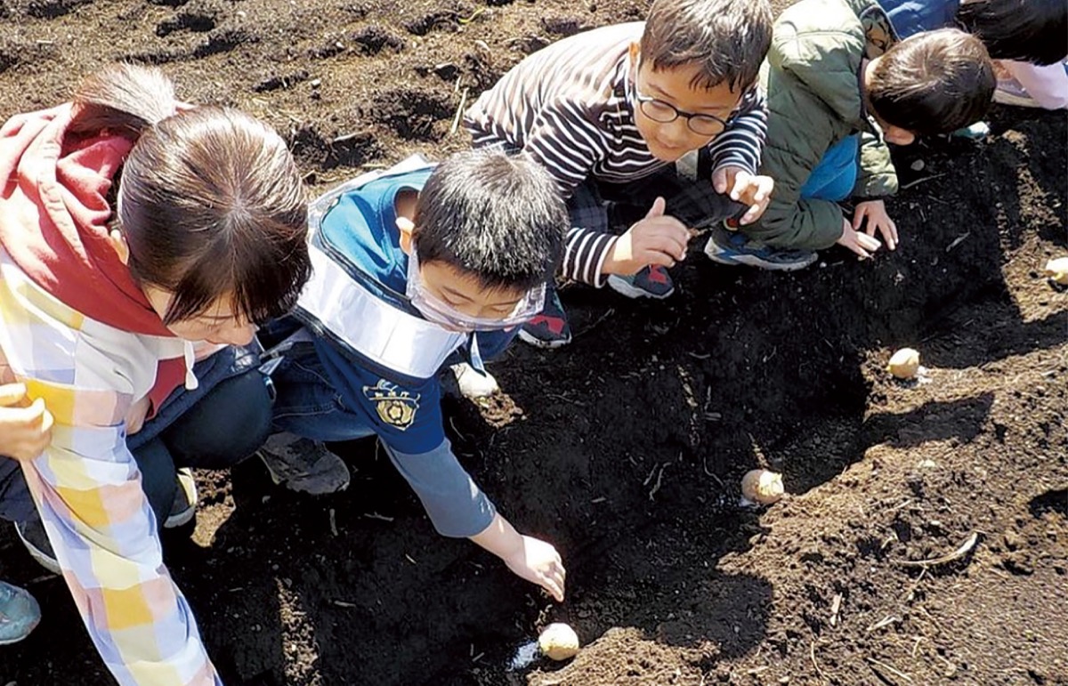 当日は年中(現年長)クラス約60人が参加。和気あいあいとした雰囲気のなかで、畝に沿って種いもを植えた。収穫は6月予定。