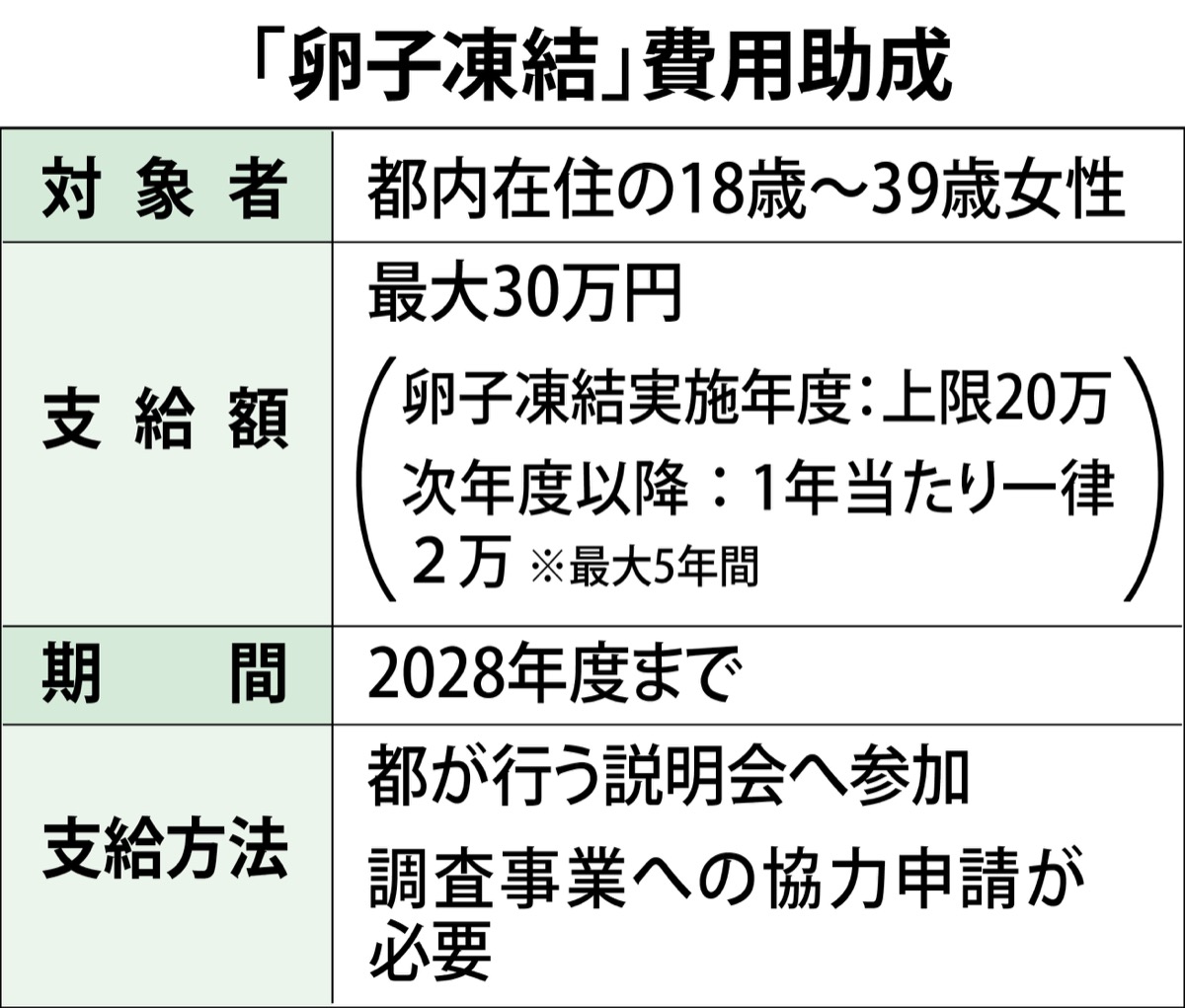 卵子凍結は、将来の妊娠や体外受精に備えて、若いうちに卵子を採取し、凍結保存しておくもの。都は「子どもがほしい女性に対する支援の拡充」「女性が自分らしく生きるためのライフプランの選択肢をつくる」ことなどを目的に昨年10月、費用助成の受付を開始。3月20日時点で申請者数は1055人に上る。