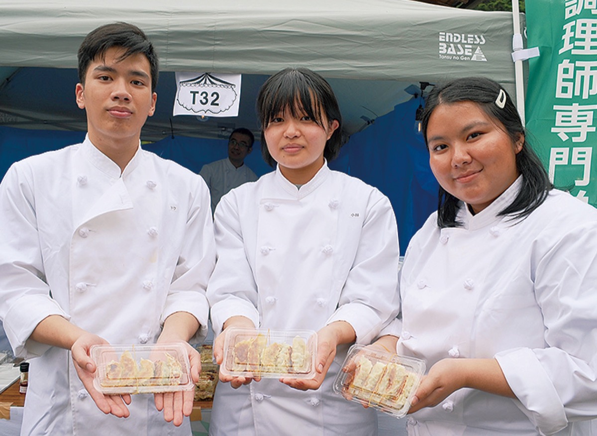 会場では和太鼓のパフォーマンスや抜刀術の披露なども催され、学生のブース出展やコラボ企画も。学生たちが手作り餃子などを販売した萠愛調理師専門学校(下恩方町)の園田京子校長は「調理師を目指す学生たちにとって、作った料理を自分たちで販売し、おいしいとほめてもらえることが、働く喜びの原点となる」と参加の意義を語った。