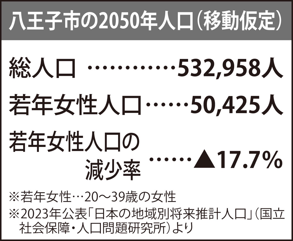 これにより50年の八王子市の若年女性人口減少率は移動仮定では17・7%減、封鎖人口では44・7%減で、14年の前回調査に比べ減少率が10ポイント以上改善しているが「自然減対策が必要」と指摘された。