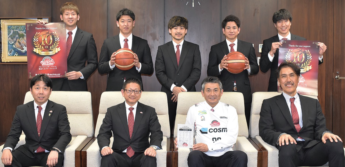 東京八王子ビートレインズが5月8日、バスケB3リーグ2023―24シーズンの終了を報告するため、室舘勲代表取締役社長をはじめ、アシスタントGMの石橋貴俊さん、アシスタントコーチの亀崎光博さん、上江田勇樹選手、東祐太選手、大金広弥選手、大城侑朔選手らが市長を表敬訪問した。