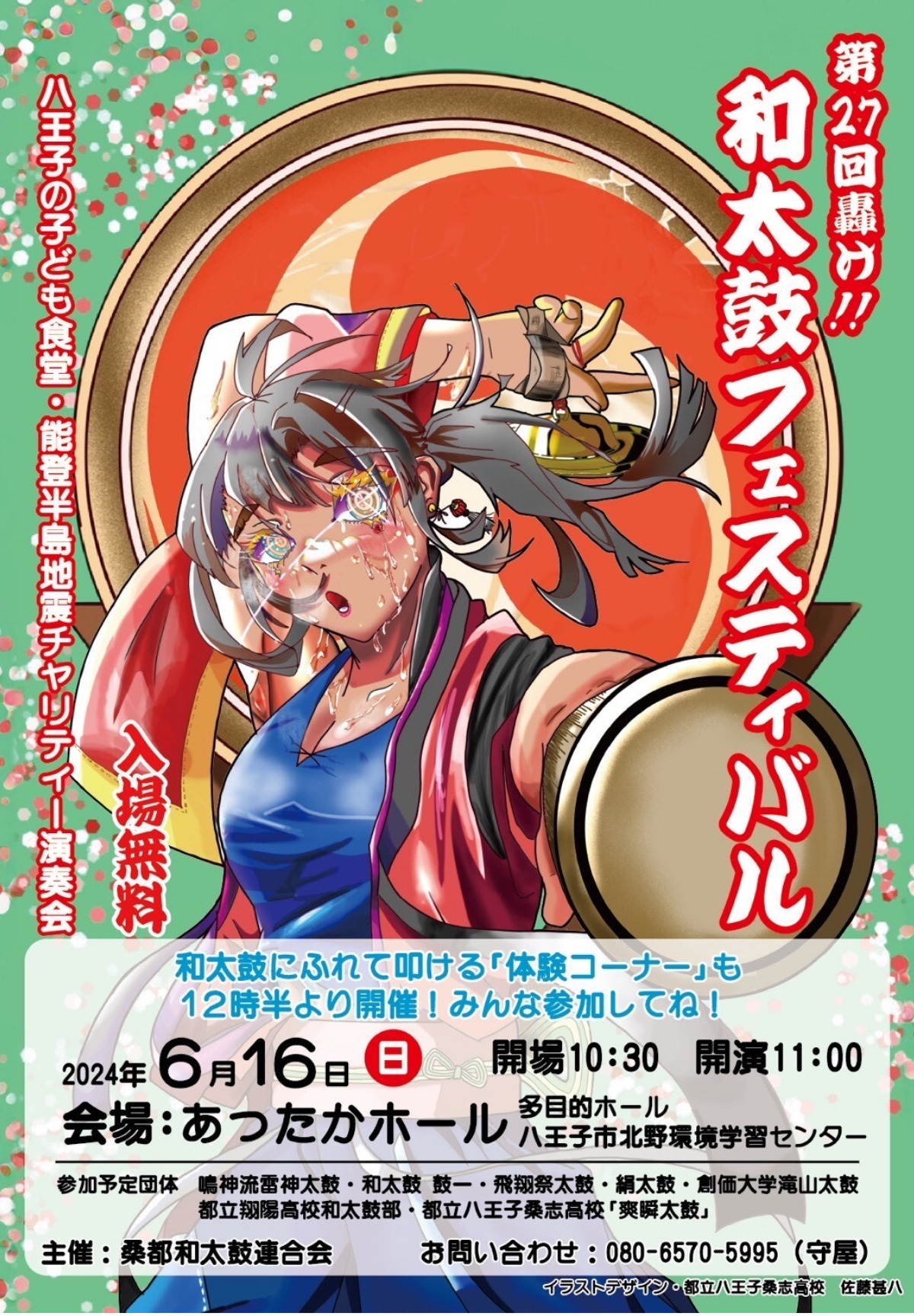 出演は鳴神流雷神太鼓、和太鼓鼓一、飛翔祭太鼓、絹太鼓、創価大学滝山太鼓、都立翔陽高校和太鼓部、都立八王子桑志高校「爽瞬太鼓」の7団体を予定。和太鼓を叩ける体験コーナーも午後0時30分から開催。